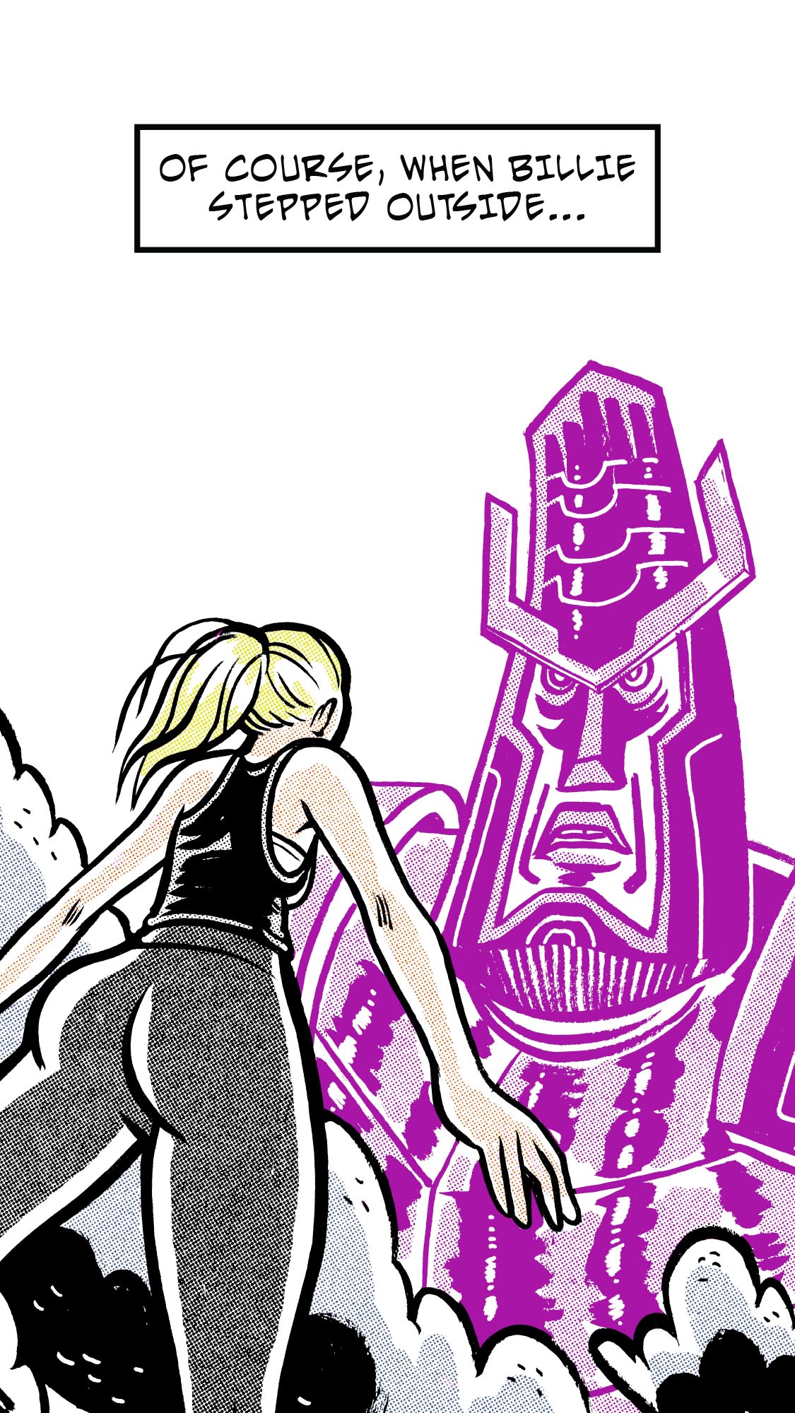 Originally published as a webcomic, and later adapted for the Macroverse platform, Basicspace is a cosmic story about mistaken identity and self discovery amidst planetary calamity. Shown here are excerpts from the Macroverse app version in no particular order.